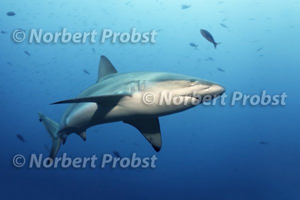 Galapagos Hai (Carcharhinus galapagensis) schwimmt im Blauwasser, Fisch, Unesco, Weltnaturerbe, Theodore, Wolf, Wenman, Insel, Galapagos Archipel, Ekuador, Südamerika, Pazifik | Galapagos shark (Carcharhinus galapagensis) swims in open water, fish, Unesco, World Nature Preserve, Theodore, Wolfe, Wenman, Island, Galapagos archipelago, Ecuador, pacific