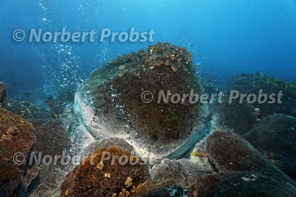 Felsen über vulkanischem Hot Spot, Mineral, weiß, Ablagerung, heiß, Quelle, Gasblasen, Bewuchs, Seepocken (Balanidae), Mexikanischer Schweinslippfisch, (Bodianus diplotaenia),Roca Redonda, Insel, Galapagos Archipel, Ekuador, Südamerika, Pazifik | Rock on vulcanic Hot Spot, white, mineral, spring, gas, bubbles, Balanidae, Mexican Hogfish (Bodianus diplotaenia), Roca Redonda, Island, Galapagos archipelago, Ecuador, Pacific