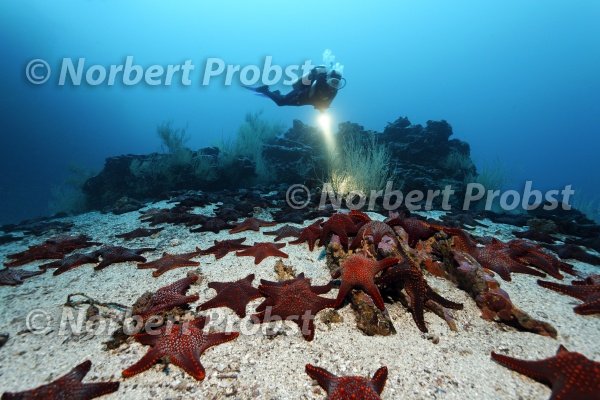 Ansammlung Panamesischer Kissenseesterne (Pentaceraster cummungi) auf Sandgrund vor Riff mit Taucher, Unesco, Weltnaturerbe, Cousin Rock, Galapagos Archipel, Ekuador, Südamerika, Pazifik | Gathering Panamic Cushion Star Fish (Pentaceraster cummungi) on sand bottom in front of reef with diver, Unesco, World Nature Preserve, Galapagos archipelago, Ecuador, Pacific