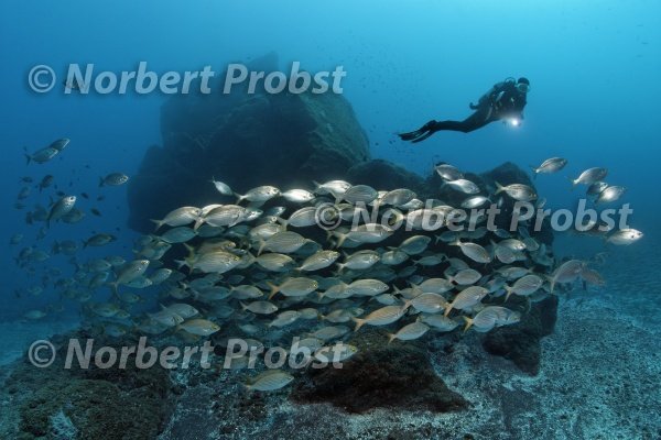 Taucher beobachtet Schwarm Goldstriemen, (Sarpa salpa) schwimmt vor Felsenriff, Insel, Madeira, Portugal, Europa, Atlantik | Diver looks at shoal Cow Bream, (Sarpa salpa) swims in front of rocky reef, Madeira, Island, Portugal, Europe, Atlantic, Ocean