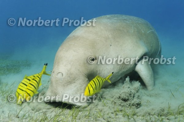 Dugong (Dugon dugon) weidet im Seegras begleitet von Gold-Makrele, (Gnathanodon speciosus), Shaab Marsa Alam, Ägypten, Rotes Meer | Sea Cow (Dugon dugon) feeds from sea weed guided by two Golden Trevally, (Gnathanodon speciosus), Shaab Marsa Alam, Egypt, Red Sea