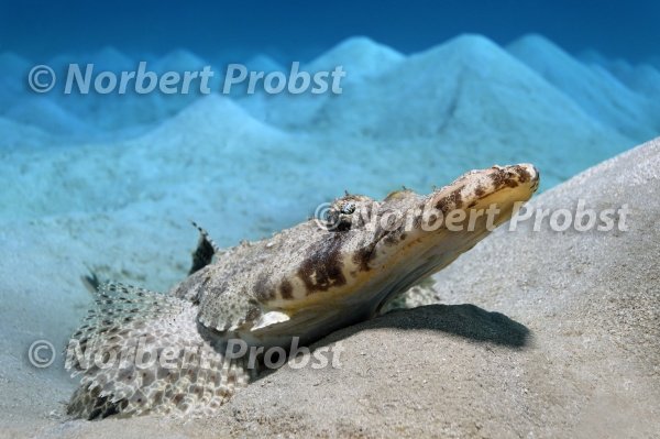 Teppich Krokodilfisch, (Papilloculiceps longiceps) liegt diagonal auf hügeligem Sandgrund, Makadi Bay, Hurghada, Ägypten, Rotes Meer, Afrika | Carpet Flat Head (Papilloculiceps longiceps) lies diagonally on hilly sand bottom, Makadi Bay, Hurghada, Egypt, Red Sea, Africa