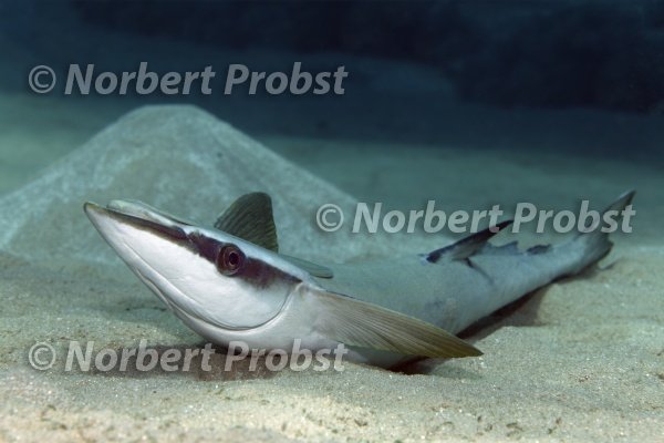 Gestreifter Schiffshalter (Echeneis naucrates) liegt auf Sandgrund, Makadi Bay, Hurghada, Ägypten, Rotes Meer, Afrika | Slender Suckerfish (Echeneis naucrates) lies on sand bottom, Makadi Bay, Hurghada, Egypt, Red Sea, Africa