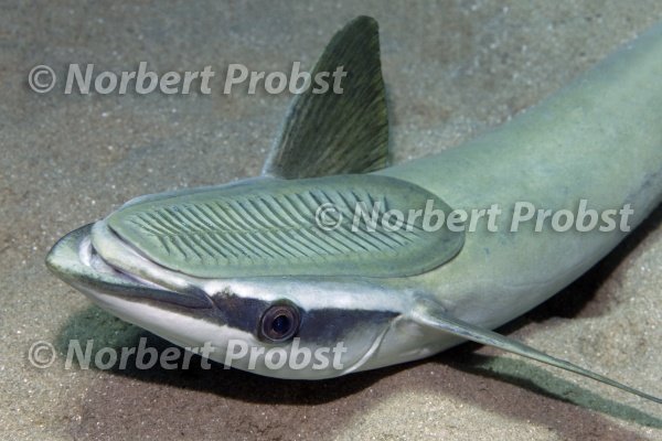Gestreifter Schiffshalter (Echeneis naucrates) liegt auf Sandgrund, Saugplatte, Portrait, Makadi Bay, Hurghada, Ägypten, Rotes Meer, Afrika | Slender Suckerfish, Sharksucker, (Echeneis naucrates) lies on sand bottom, sucker-like organ, portrait, Makadi Bay, Hurghada, Egypt, Red Sea, Africa