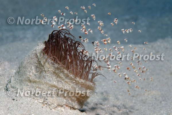 Schwarm winzige Schwebegarnelen (Idiomysis tsurnamali) schwimmen um Zylinderrose (Ceriantharia), Makadi Bay, Hurghada, Ägypten, Rotes Meer | School tiny Shrimps (Idiomysis tsurnamali) hoovering around Cylinder anemone, Makadi Bay, Hurghada, Egypt, Red Sea