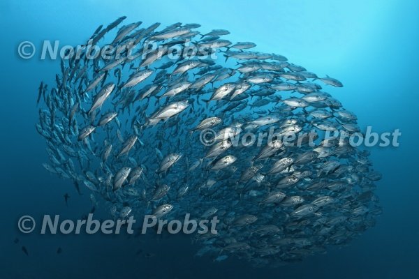 Schwarm Großaugenmakrelen (Caranx sexfasciatus) schwimmt im Blau, Bali, Indonesien, Indischer Ozean, Bali Meer.| School Bigeye trevallies (Caranx sexfasciatus) swim at the blue, Bali, Indonesia, Indian Ocean, Bali Sea
