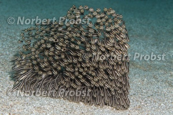 Schwarm, jung, Gestreifter Korallenwels, (Plotosus lineatus), schwimmt in herzform über Sandgrund, Saparua, Insel, Molukken, Banda See, Pazifik, Indonesien | Shoal juvenile Striped eel catfish, (Plotosus lineatus), swims above sand bottom in heart shape, Saparua, island, Maluku, islands, Banda Sea, Pacific, Indonesia, Pacific