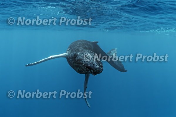 Buckelwal (Megaptera novaeangliae), Jungtier, Kalb, schwimmt im offenen Meer, Silver Bank, Silver and Navidad Bank Sanctuary, Atlantischer Ozean, Dominikanische Republik | Humpback whale, (Megaptera novaeangliae), juvenile, calf, swims at open water, Silver Bank, Silver and Navidad Bank Sanctuary, Atlantic Ocean, Dominican Republic