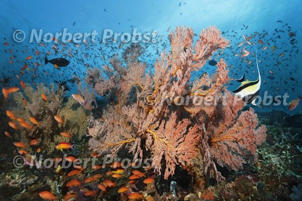 Schwarm verschiedene Fahnenbarsche, (Anthiinae), schwimmt über Korallenriff, mit Gorgonie, (Melithea ochracea), Halfterfisch, (Zanclus cornutus) Großes Barriereriff, UNESCO, Weltnaturerbe, Queensland, Cairns, Pazifischer Ozean, Australien | School different Fairy basslets, (Anthiinae), swims over coral reef, with sea fan, (Melithea ochracea), Moorish idol, (Zanclus cornutus), Great Barrier Reef, UNESCO, World Heritage Site, Queensland, Cairns, Pacific, Ocean, Australia