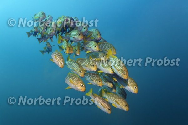 Schwarm Goldband Süßlippen (Plectorhinchus polytaenia) schwimmt im offenen Meer, Raja Ampat Archipel, Papua Barat, West-Neuguinea, Pazifik, Indonesien | School of Ribboned Sweetlip (Plectorhinchus polytaenia), Raja Ampat archipelago, Papua Barat, West-New Guinea, Pacific, Indonesia