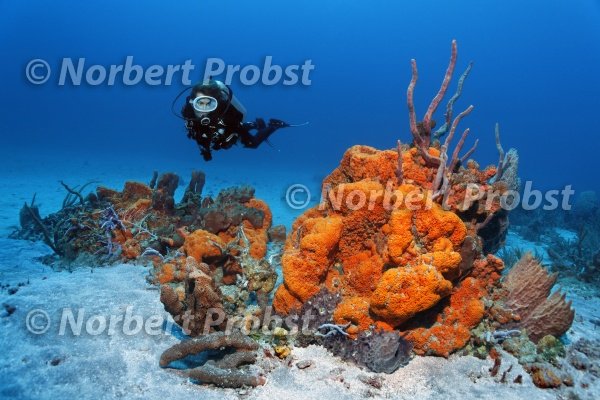 Taucher betrachtet Formation, verschiedene, vielfarbige, Schwämme, Oranger Elefantenohrschwamm, (Agelas clathrodes), Korallen, Sandgrund, Little Tobago, Speyside, Trinidad & Tobago, Kleine Antillen, Karibik | Diver looks at formation, differnt, colorful, sponges, Orange elephant ear sponge, (Agelas clathrodes), corals, sandy bottom, Little Tobago, Speyside, Trinidad