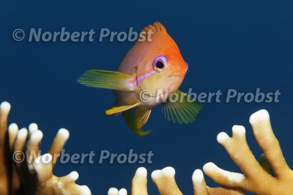 Faden Fahnenbarsch (Nemanthias carberryi) schwimmt über Feuerkoralle, Makadi Bay, Hurghada, Ägypten, Rotes Meer | Threadfin Goldie (Nemanthias carberryi) swims over Fire Coral, Makadi Bay, Hurghada, Egypt, Red Sea