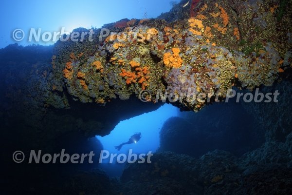 Taucher mit hinter Felsentor mit Bewuchs an Schwämmen (Polifera) und Gelbe Steinkoralle (Leptopsammia pruvoti), Insel Korfu, Ionische Inseln, Griechenland Mittelmeer | Diver behind rocky gate with Sponges (Polifera) and Sunset cupcoral (Leptopsammia pruvoti), Corfu island, Ionian Islands, Greece, Mediterranean Sea