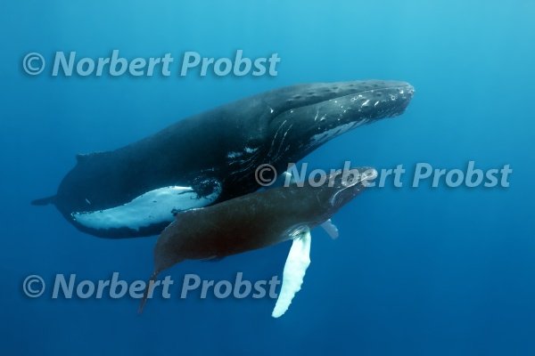 Buckelwal (Megaptera novaeangliae), weiblich, Kuh, mit Jungtier, Kalb, schwimmt im offenen Meer, Silver Bank, Silver and Navidad Bank Sanctuary, Atlantischer Ozean, Dominikanische Republik | Female Humpback whale, cow, (Megaptera novaeangliae), with juvenile calf, swims at open water, Silver Bank, Silver and Navidad Bank Sanctuary, Atlantic Ocean, Dominican Republic