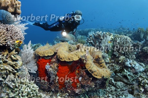Taucher betrachtet Riesenmuschel, (Tridacna gigas), im Korallenriff, Taucherin, Großes Barriereriff, UNESCO, Weltnaturerbe, Queensland, Cairns, Australien, Pazifik | Diver looks at Giant Clam, (Tridacna gigas), at coral reef, female diver, Great Barrier Reef, UNESCO, World Heritage Site, Queensland, Cairns, Australia, Pacific, Ocean