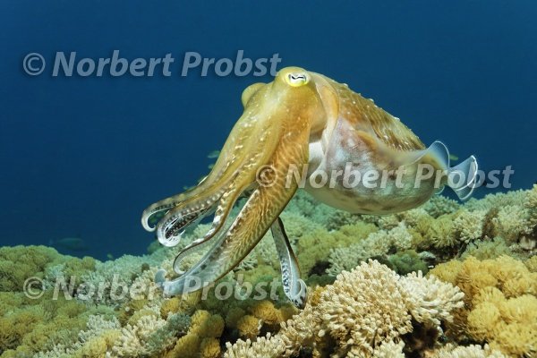 Breitarm-Sepia oder Breitkeulen-Sepia oder Breitband Sepia, (Sepia latimanus), schwimmt über Korallenriff, Riffdach, Großes Barriereriff, UNESCO, Weltnaturerbe, Queensland, Cairns, Australien, Pazifik | Broadclub Cuttlefish or Reef Cuttlefish, (Sepia latimanus), swims above coral reef top, Great Barrier Reef, UNESCO, World Heritage Site, Queensland, Cairns, Australia, Pacific, Ocean