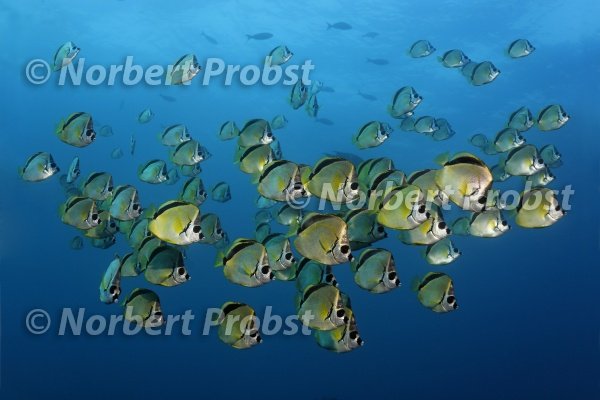 Barbier Falterfisch (Johnrandallia nigrirostris) viele, Schwarm, schwimmen im Blauwasser, Nord Seymore, Insel, Galapagos Archipel, Ekuador, Südamerika, Pazifik | Barberfish (Johnrandallia nigrirostris) many, shoal, swimming in open water, North Seymore, Island, Galapagos archipelago, Ecuador, Pacific