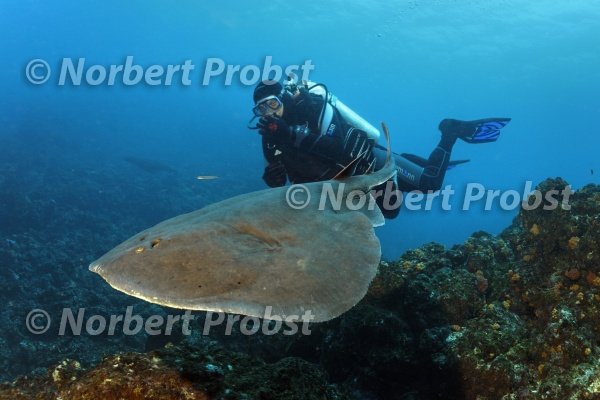 Zitterrochen (Narcine entemedor), Schgwimmt übers Riff, Taucher, Rochen, Fisch, Unesco Weltkulturerbe, Cabo Marshall, Galapagos Archipel, Ekuador, Südamerika, Pazifik | Giant electric ray, (Narcine entemedor), swims along the reef, diver, ray, fish, Unesco, World Heritage Site, Cabo Marshall, Galapagos archipelago, Ecuador, pacific