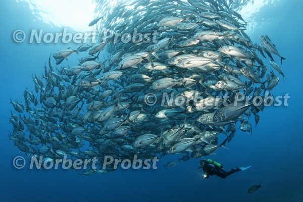 Schwarm Großaugenmakrelen, (Caranx Sexfasciatus), Taucher, Fische, schwimmt im Blauwasser. Tulamben, Bali, Indonesien, Indischer Ozean, Bali Meer | Cruising at the blue: A shoal Bigeye travallys, (Caranx Sexfasciatus). Diver, fishes Tulamben, Bali, Indonesia, Indian Ocean, Bali Sea