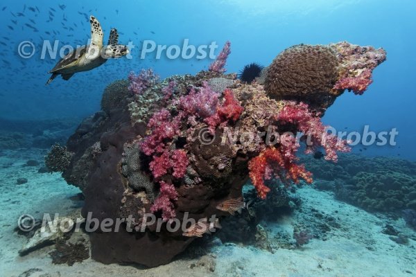 | Echte Karettschildkröte, (Eretmochelys imbricata), schwimmt über Korallenriff, Korallenblock, mit verschiedenen Korallen, Daymaniyat Inseln Natur Reservat, Khawr Suwasi, Al-Batina Provinz, Sultanat von Oman, Arabische Halbinsel Asien, Golf von Oman, Indischer Ozean | Hawksbill Sea Turtle, (Eretmochelys imbicata), swims over coral reef block with different soft and hard corals, Daymaniyat islands natur preserve, Khawr Suwasi, Al-Batina province, Sultanate of Oman, arabic peninsula, Asia, Gulf of |