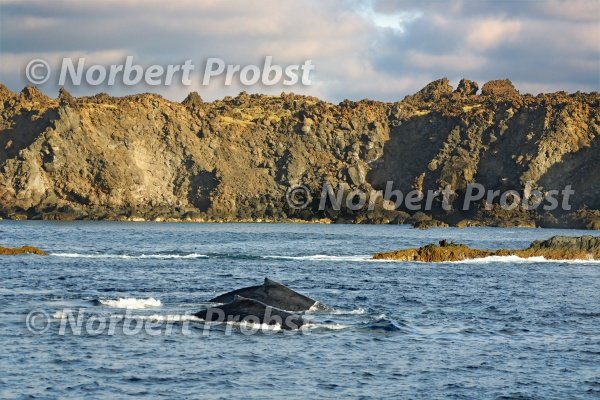 Buckelwal, (Megaptera novaeangliae), Rücken, Finne, Meeresoberfläche, Felsen, Küste, San Benedicto, Insel, bei Socorro, Revillagigedo Inseln, Archipel, Mexiko, Ost-Pazifik | Humpback whale, (Megaptera novaeangliae), back, fin, sea, surface, rock, coast, San Benedicto, Island, close Socorro, Socorro, Revillagigedo Islands, Archipelago, Mexico, East-Pacific