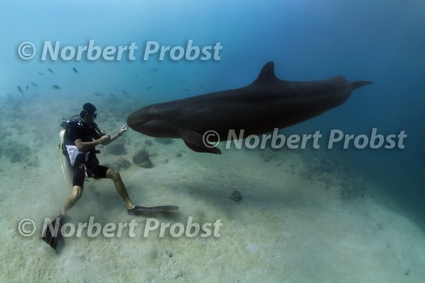 Taucher begegnet Kleiner Schwertwal (Pseudorca crassidens), Begegnung, berührt, Berührung, Delfin, Wal, Sandgrund, aufregend, Subic Bay, Insel, Luzon, Philippinen, Südchinesisches Meer, Pazifik | Diver meets False Killer Whale (Pseudorca crassidens) encounter, touch, dolphin, whale, exciting, Subic Bay, Luzon, Island, Philippines, South China Sea, Pacific