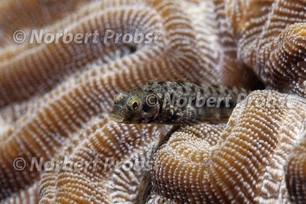 Gebänderter Hechtschleimfisch, (Acanthemblemaria maria), schaut aus Unterschlupt in Gehirnkoralle, LCA, Saint Lucia, St. Lucia, Insel, Inseln unter dem Wind, Kleine Antillen, Karibik, Karibisches Meer | Secretairy blenny (Acanthemblemaria maria) looks out of its hideaway in brain coral, LCA, Saint Lucia, St. Lucia, island, Windward Islands, Lesser Antilles, Caribbean, Caribbean Sea