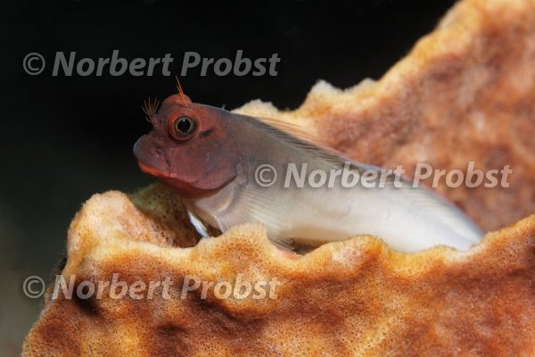 Zweifarben-Kammzähner, (Ophioblennius atlanticus), sitzt in einem Schwamm, LCA, Saint Lucia, St. Lucia, Insel, Inseln unter dem Wind, Kleine Antillen, Karibik, Karibisches Meer | Redlip Blenny, (Ophioblennius atlanticus) in a sponge, LCA, Saint Lucia, St. Lucia, island, Windward Islands, Lesser Antilles, Caribbean, Caribbean Sea