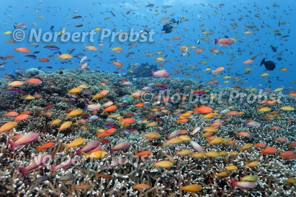 Schwarm verschieder Fahnenbarsche, (Anthiinae), schwimmt über Steinkorallen, Korallenriff, Großes Barriereriff, UNESCO, Weltnaturerbe, Queensland, Cairns, Australien, Pazifik | School different Fairy basslets, (Anthiinae), swims over stone coral reef, Great Barrier Reef, UNESCO, World Heritage Site, Queensland, Cairns, Australia, Pacific, Ocean