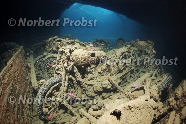 Northon 16 H Motorad Ladung auf britischem, Schiffswrack, Dampfschiff SS Thistlegorm, Munitionsfrachter, Stapellauf 09.04.1940 in Sunderland, Schottland, versenkt Zweiter Weltkrieg, 06.10.1941 durch deutsches Flugzeug Heinkel He-111 am Shaab Ali, Halbinsel Sinai, Ägypten, Rotes Meer | Northon 16 H motorcycle load inside British shipwreck, Steamship, SS Thistlegorm, Munition Freighter, launching 09.04.1941 in Sunderland, Scottland, sunk in second World War, 06.10.1941 from German aeroplane Heinke