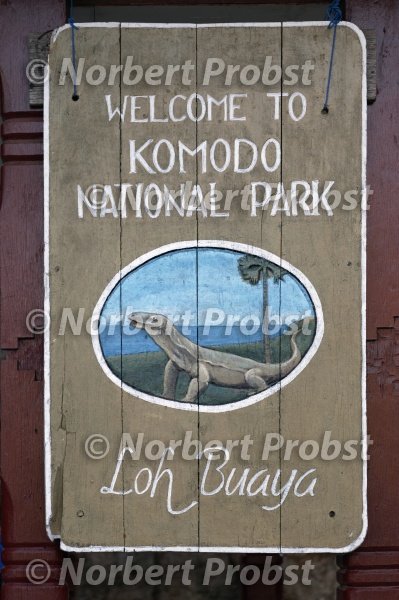 Hinweisschild mit Komodowaran (Varanus komodoensis), Komodo Nationalpark, Unesco Weltnaturerbe, Insel Komodo, Kleine Sundainseln, Indonesien | Sign with Komodo Dragon (Varanus komodoensis), Komodo National Park, Unesco World Hertage Site, Komodo Island, Lesser Sunda Islands, Indonesia