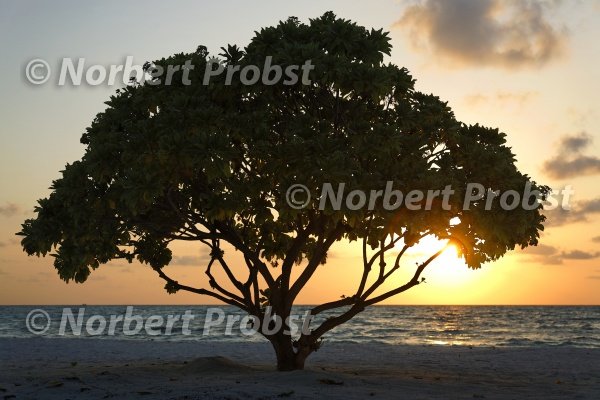 Malerische Silhouette, Baum, untergehender Sonne am Meer, Palmen, Rihiveli, Insel, Süd Male Atoll, Malediven, Archipel, Indischer Ozean, Asien | Pittoresque Silhouette of tree in sunset at sea, Rihilveli, South Male Atoll, Island, Maldives, Archipelago, Indian Ocean, Asia