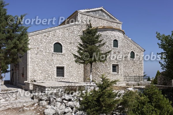 Kirche im Kloster Pantokratoros auf Gipfel von Korfus höchtem Berg Mount Pantokrator (Allesbeherrscher) 906 Meter Höhe, Insel Korfu, Ionische Inseln, Griechenland | Monastary Pantokratoros church on summit of Corfus highest mountain Pantokrator (Emperor) 906 meters high, Corfu island, Ionian Islands, Greece
