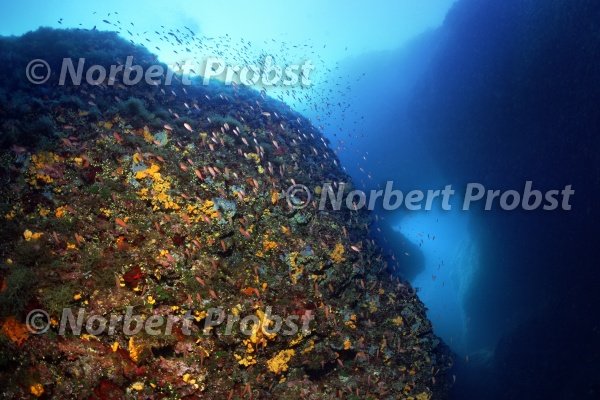 Durchbruch im Felsen, dicht mit vielfarbigen Schwämmen (Porifera) Gelben Steinkorallen (Leptopsammia pruvoti und Algen (Algae) bewachsenes Riff mit Schwarm Roter Fahnenbarsch (Anthias anthias), Insel Korfu, Ionische Inseln, Griechenland Mittelmeer | Rock with breakthrough, reef overgrown with multicolor sponges (Porifera), Corfu island, Ionian Islands, Greece, Mediterranean Sea