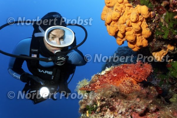 Taucher betrachtet Großer Skorpionfisch (Scorpaena scrofa) und Oranger Hornschwamm (Agelas oroides), Insel Korfu, Ionische Inseln, Griechenland Mittelmeer | Diver looks at Red scopionfish, Bigscale scopionfish, Large-scaled scorpion fish (Scorpaena scrofa) and Orange sponge (Agelas oroides),Corfu island, Ionian Islands, Greece, Mediterranean Sea