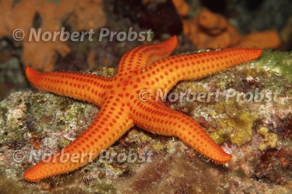 Orangefarbener Seestern, Glatter Seestern (Hacelia attenuata), Halbinsel Sithonia, Chalkidiki, auch Halkidiki, Ägäis, Mittelmeer, Griechenland | Orange Sea star (Hecelia attenuata), Peninsula Sithonia, Chalkidiki or Halkidiki, Aegean, Mediterranean Sea, Greece
