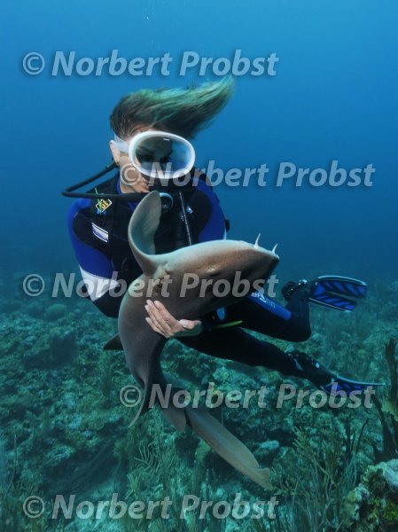 Taucherin mit Karibik-Ammenhai (Ginglymostoma cirratum) im Arm. Fasziniert streichelt Taucher Tier auf Unterseite. Spezielle Berührung lässt Hai in Apathie fallen. Gefährliches Spiel. Barriereriff, San Pedro, Insel, Ambergris Cay, Belize, Mittelamerika, Zentralamerika, Karibik
