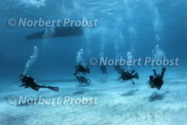 Tauchergruppe schwimmt vom Tauchboot über Sandgrund zum Korallenriff, Half Moon Cay, Lighthouse Reef, Turneffe Atoll, Belize, Mittelamerika, Zentralamerika, Karibik