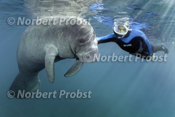 Taucher mit Karibik-Manati oder Nagel-Manati (Trichechus manatus), Three Sisters Springs, Manati Schutzgebiet, Crystal River, Florida, USA | Diver with West Indian manatee or Sea Cow (Trichechus manatus), Three Sisters Springs, Manatee Sanctuaries, Crystal River, Florida, USA