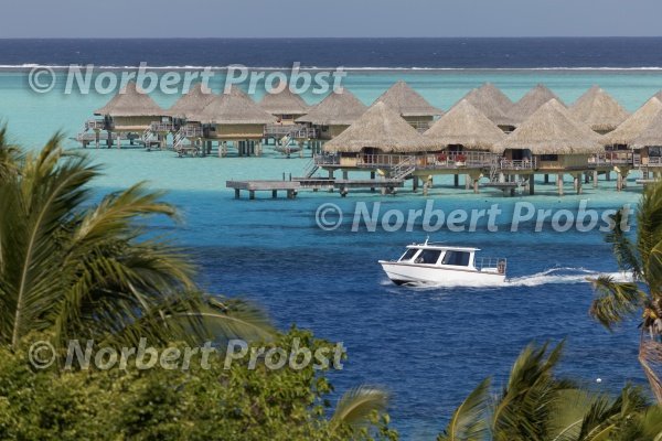 Motorboot, Wasserbungalows, Sofitel Bora Bora, Insel, Bora Bora, Inseln unter dem Winde, Gesellschaftsinseln, Französisch Polynesien, Frankreich, Ozeanien | Motor boat, overwater bungalows, Sofitel Bora Bora, island, Bora Bora, Windward Islands, Society Islands, French Polynesia, France, Oceania