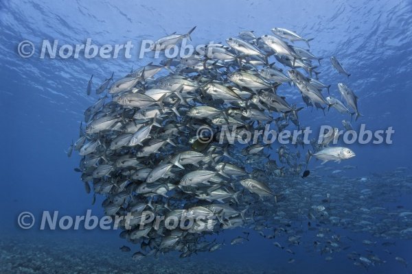 Schwarm Großaugenmakrele (Caranx sexfasciatus), Pazifik Französisch Polynesien, Frankreich, Pazifik | Bigeye Travallies, (Caranx sexfasciatus), Pacific, Windward islands, French Polynesia, France