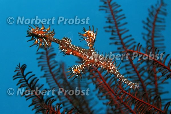 Schmuck-Geisterpfeifenfisch (Solenostomus paradoxus) lebt gut getarnt im Federstern, Gangga Insel, Bangka Inseln, Nord Sulewesi, Indonesien, Molukkensee, Pazifik, Asien | Magnificent Gostpipefish lives camouflaged in feather star. Gangga Island, Bangka Islands, North Sulawesi, Indonesia, Molukka Sea, Pacific, Asia