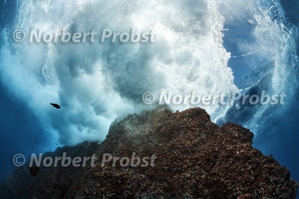 Aufragender, von Wellen umspülter Felsen, Riff, Felsenriff, Roca Partida, Socorro, Revillagigedo Inseln, Archipel, Mexiko, Ost-Pazifik | Giant erecting rock, reef, ocean bathed, Roca Partida, Socorro, Revillagigedo Islands, Archipelago, Mexico, East-Pacific