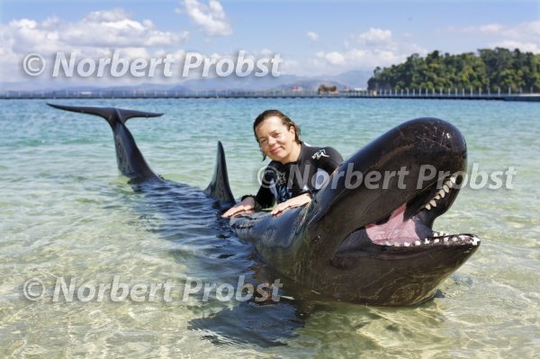 Frau streichelt Kleiner Schwertwal (Pseudorca crassidens) aufgerissenes Maul, Zähne, Zunge, Schlund, Strand, Wal, Säugetier, über Wasser, Ocean Adventures, Subic Bay, Insel, Luzon, Philippinen, Südchinesisches Meer, Pazifik | Woman strokes False Killer Whale (Pseudorca crassidens) lacerated mouth, yap, throat, jaw, wide open, beach, teeth, tongue, above water, Ocean Adventures, Subic Bay, Luzon, Island, Philippines, South China Sea, Pacific