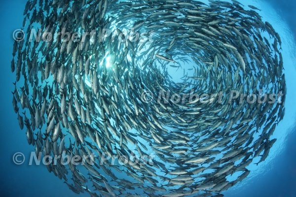 Großer Schwarm Großaugen-Makrelen, (Caranx sexfasciatus), schwimmt im offenen Meer im Kreis, Großes Barriereriff, UNESCO, Weltnaturerbe, Queensland, Cairns, Australien, Pazifik | Large shoal Bigeeye-Trevallys, (Caranx sexfasciatus), swims in open water circles, Great Barrier Reef, UNESCO, World Heritage Site, Queensland, Cairns, Australia, Pacific, Ocean